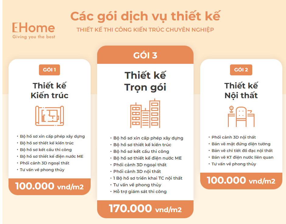 Lưu ý: Giá có thể thay đổi tùy theo quy mô và mức độ chi tiết của dự án. Quý khách sẽ được tư vấn chi tiết khi làm việc trực tiếp với đội ngũ Ehome.